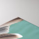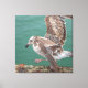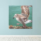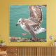Ett fiskmås med bruna och vita fjädrar står på ett avvandrat pir och vingar spreds som om man förbereder sig för att ta flyget. Fågelns huvud är vänt mot sidan, dess gult är lätt öppen. Bakgrunden är en lugn, ett hav med färgad och skapar en fridfull och fredlig atmosfär.