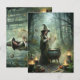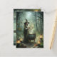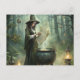 Gå in i en omvälvd skog där magin kommer levande. Det här vykortet innehåller en ung häxa med mörk hår, klädd i en flytande grönt och matchande hatt, som läser från en gammal rulla. Perfekt för älskare av häxkonst, fantasi och mystiska gåvor, den här designen fångar det väsentliga i fantasi, ritual och .