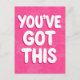 Playful motivational text chunky rounded typography in white on pink textured background.