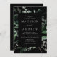 Eleganta bröllopsinbjudningar med dina bröllopsdetaljer inklämda i en rektangulär ram omgiven av eukalyptus, ormbunkar och annan rik grönska mot en svart bakgrund. De moderna botaniska bröllopsinbjudningarna har en enfärgad svart baksida. Designade för att samordna med vår Abundant Greenery bröllopssamling.