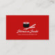 Enkla och smart grafiska visitkortar i en ljus varm röd och kontrastera vit med en enkel grafisk sushikonst av kotlettpinnar och slågna in sushi. Ideal för sushikockar eller lilla sushirestauranger eller affärer. Skräddarsy med ditt egna adress, namn, website och telefonnummer. Design och konstverk av Sarah Trett.
