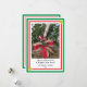 Festive wood Yule log with evergreen pine needle boughs, pine cone and red beige burlap bow Leave image on front, or Upload your own. Green and red geometric pattern with gold stars elements against white background. Insert Name and Year. Typography and red white candy canes and festive Christmas tree on backside. Original Photography and Artwork, Verse by TamiraZDesigns.