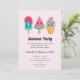 En inbjudan till en fest med en illustration av tre olika glassbehandlingar. En blå grönt med jordgubbsborrningar och färgstarka sprinkler. En vattenmelonpopsikel. En kon med lagrar av delikat glass i rosa och mynta. Alla med söta kawaii-leenden.