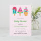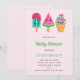 Babyduschinbjudan med en illustration av tre olika glassbehandlingar. En blå grönt med jordgubbsborrningar och färgstarka sprinkler. En vattenmelonpopsikel. En kon med lagrar av delikat glass i rosa och mynta. Alla med söta kawaii-leenden.