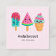 Affärskort med illustration av tre olika glassbehandlingar. En blå grönt med jordgubbsborrningar och färgstarka sprinkler. En vattenmelonpopsikel. En kon med lagrar av delikat glass i rosa och mynta. Alla med söta kawaii-leenden.
