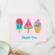 Tack kort med en illustration av tre olika glassbehandlingar. En blå grönt med jordgubbsborrningar och färgstarka sprinkler. En vattenmelonpopsikel. En kon med lagrar av delikat glass i rosa och mynta. Alla med söta kawaii-leenden.