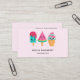 Affärskort med illustration av tre olika glassbehandlingar. En blå grönt med jordgubbsborrningar och färgstarka sprinkler. En vattenmelonpopsikel. En kon med lagrar av delikat glass i rosa och mynta. Alla med söta kawaii-leenden.