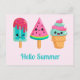Ett vykort med en illustration av tre olika glassbehandlingar. En blå grönt med jordgubbsborrningar och färgstarka sprinkler. En vattenmelonpopsikel. En kon med lagrar av delikat glass i rosa och mynta. Alla med söta kawaii-leenden.