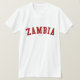 Kontrollera ut denna Zambia t-skjorta! Är du från Zambia? Har du en vän eller en familjemedlem som älskar Zambia? Om så, är denna "baner" t-skjorta exakt gåvan som du söker efter! Designen presenterar "Zambia" i välvd röd bokstäver i klassikerhögskolastilsorten.