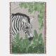 My design features a black and white zebra walking amongst the monstera, ivy and bird of paradise leaves.