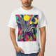 A.I. Assisterad utskrift av en zebra står mitt i en pulserande, flerfärgad löv med en psykodelisk bakgrund av strålande cirklar och ett halvljus måne.