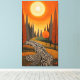 A mesmerizing fusion of African wildlife and Aboriginal dot art style, this digital artwork features a flowing zebra-patterned river winding through a vibrant, autumnal landscape. Towering trees frame the scene under a radiant sunburst sky, while a lone orange tree glows against rolling hills. Rich textures and bold colors create a hypnotic, dreamlike atmosphere — perfect for adding warmth and wild elegance to any space.