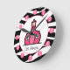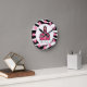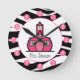 En klocka med zebra tryck-utformning och logotyp av Rosa Schoolhouse. Anpassa med ditt namn under skolhuset. Klocket har vita nummer på rosa punkter.