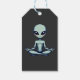 "Den här stilla designen har en tecknad-stil-utlänning med ljusblått grönt, stort svart ögon och ett serenuttryck som sitter i en lotus meditationsform. Händer vilar försiktigt på knä i en meditativ mudra. Denna utformning förmedlar en känsla av fred, sinnesstämning och annan världslig lugn. Denna mångsidiga utformning skulle kunna användas för produkter som främjar avslappning, meditation eller en aning kosmisk stollig. Föreställ dig det på yoga kläder, meditationsdynor, lugnande hemdekor eller inspirationspaterial."