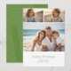Framsida - En 3-fotomall i ett enkelt rutnät med vit gräns. Vit bakgrund med ett enkelt, minimalt typsnitt för hälsning. Typen är i en avstängd grönt. Bakåt - Gröntens bakgrund med en nyanserad bild. Alla färg kan ändras i det avancerade designområdet.