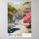 Zen trädgårdslandskapsaffisch Rosa träd, Krattad sand & Modernt hus – Japansk väggkonst