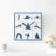 Lägg till Zen i väggkonsten. Yoga Positions on Square Wall Clock with a blue gräns. Underbar temadekanter för ett meditationsrum eller studio.