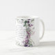 I den inspirerande skripturkaffet mugg visas blommigt vattenfärgsvilda blommor i mjuk färg av dammig lila, rosa och mjuk grönt. Den har Bible Verse Zephaniah 3:17, "LORD din GOD mitt i dig, Den mäktiga, kommer att spara. Han kommer att glädja sig underbart över dig, han kommer att tysta dig med Hans kärlek, han kommer att glädja dig med att sjunga."
