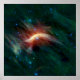 Zeta Ophiuchi Den blå stjärnan nära bildens centrum är Zeta Ophiuchi. Zeta Ophiuchi är i själva verket en mycket massiv, hett, ljusblå stjärna som blåser sig igenom ett stort moln av mellanliggande damm och gas. Astronomerna teorierade att denna stellar juggernaut troligtvis var en gång av ett binärt stjärnsystem med en ännu mer omfattande partner. När partnern exploderade som supernova, sprängde bort större delen av sin massa, blev Zeta Ophiuchi plötsligt befriad från sin partners dragkraft och sköts bort som en kula 24 kilometer per sekund (54 000 miles per timme). Zeta Ophiuchi är cirka 20 gånger mer massivt och 65 000 gånger mer ljust än sol. Om det inte omgavs av så mycket damm skulle det vara en av de ljusaste stjärnorna i himlar och visa sig blått för öga. Liksom alla stjärnor med denna extrema massa och kraft, skriver den under mottot "leva snabbt, dö ung". Det är redan ungefär halvvägs igenom sin kort 8 miljoner-åriga livslängd. Som jämförelse kan nämnas att sol är ungefär halvvägs genom sin tiomiljardåriga livslängd. Medan sol så småningom kommer att bli en tyst vit dvärg kommer Zeta Ophiuchi, precis som sin tidigare partner, att dö i en massiv explosion som kallas supernova. De kanske intressantaste funktionerna i den här bilden har att göra med den gas och det damm som omger Zeta Ophiuchi. Av till bildens sidor och i bakgrunden är dammoln som är relativt lugn, framträdande grönt och klokhet, något som påminner om norra ljus. Nära Zeta Ophiuchi ser dessa moln helt annorlunda ut. Molnet i alla riktningar runt stjärnan är ljusare och rödare, eftersom de extrema mängder ultraviolett strålning som avges av stjärnan värmer upp molnet, vilket gör att det ljusnar mer i infrarödet än vanligt. Ännu mer slående är dock att den ljusa gulten böjs direkt ovanför Zeta Ophiuchi. Detta är ett utmärkt exempel på en bockchock. I den här bilden flyger stjärnan från nedre högerna till övre lämnat. Den mycket kraftfulla stellära vinden pressar ut gas och damm ur dess väg (den stellära vinden sträcker sig långt bortom den synliga delen av stjärnan och skapar en osynlig "bubbla" runt hela den). Och direkt framför stjärnans väg komprimerar vinden gasen så mycket att den glöms oerhört ljusa (i infraröda) och skapar en bågstöt. Det liknar den effekt man kan se när en båt skjuter en våg framför sig när den rör sig genom vatten. Funktionen göms helt i synligt ljus. Infraröd bilder, som detta från WISE, kastar ett helt nytt ljus över regionen. Det färg som används i den här bilden representerar specifika våglängder för infrarött ljus. Blått och cyan (blå grönt) representerar ljus som avges vid våglängder på 3,4 och 4,6 mikron, som huvudsakligen kommer från stjärnor. Grönt och rött representerar ljus från 12 mikrometer respektive 22 mikrometer, som till största delen avges av stoft. Redigerad text från NASA.