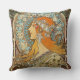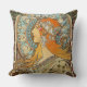 A dekorativ kudde med litografiet Zodiac (1896) av Alphonse Mucha, en tjeckisk skapad illustratör och målare. En porträtt av en kvinna med juveler i sitt hår sitta framför ett zodiakdiagram.