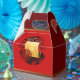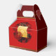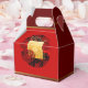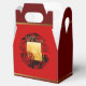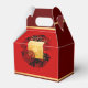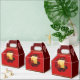 Röd Ox pappert klippt (tryckt bild) i hörnet av en rund bild med drakar och bamboosilhouette och en fyrkantig bild av de 12 kinesiska zodiaktecknen + Yin Yang-symbolen med hälsning högst upp på engelska (guld-tecken och skugga inte anpassade). Utformning på ruta för böjlig favör (förlaga nr 2).