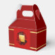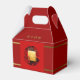 Pappert skurna röda Råtta (tryckt bild) i hörnet av en rund bild med drakar och bambu silhouette och en fyrkantig bild av de 12 kinesiska zodiaktecknen + Yin Yang-symbolen med hälsning överst på engelska (guld-tecken och skugga, inte anpassade). Utformning på en justerbar faväruta.
