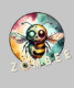 This design features a horror-themed fantasy illustration of a bee reimagined as a zombie, aptly titled "Zombee." The bee has large, exaggerated eyes with one appearing to be popping out, and its mouth agape with a trickle of blood, enhancing its undead appearance. It showcases a detailed and vibrant watercolor style with a blend of warm and cool tones in the background, creating a striking contrast with the creature. The play on words in the title adds an element of dark humor to this eerie yet captivating artwork.