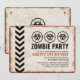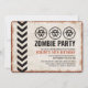 Vintage-inbjudan till en zombie-apokalyps tema-fest med en väderbiten skylt och biofara-symboler.