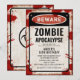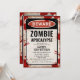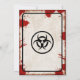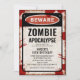Vintage inbjudan till zombie-apokalyps tema-fest med rostig VARNING-skylt, blodfläckar, biosäkerhetsskylt och skruvar.