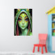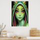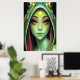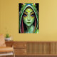 En Porträtt av en coola grönt, blå ögonögd ung dam med en grodbeanie. Det här är en AI-skapad konst.