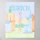Denna design är en charmerande, pastellpräglad illustration inspirerad av Zürich, Schweiz. Sammansättningen har en mjuk, blå och grönt bakgrund som frammanar de schweiziska Alpernornas serene och scenskönhet, som avbildas med bergsilhuetter. Framstående arkitektoniskt inslag som Züchs koniska kyrka torn är stiliserad i pastellblå och orangar, vilket ge bilden som en vismisk känsla.